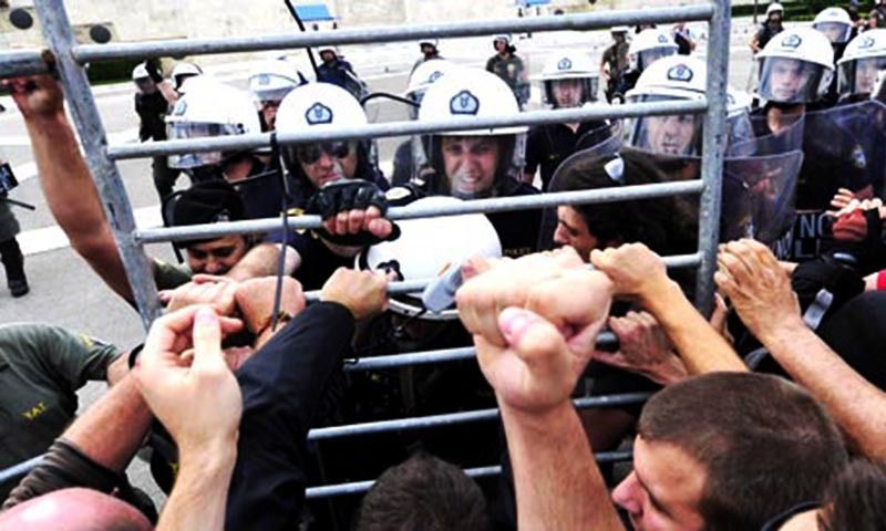 Greek riot police officers confront with protestors in front of the Greek parliament during a general strike against government austerity plans, in Athens on June 15, 2011. Offices were closed and public transport on land and sea across Greece was seriously disrupted early today as a mass general strike got under way. AFP PHOTO / Louisa Gouliamaki
