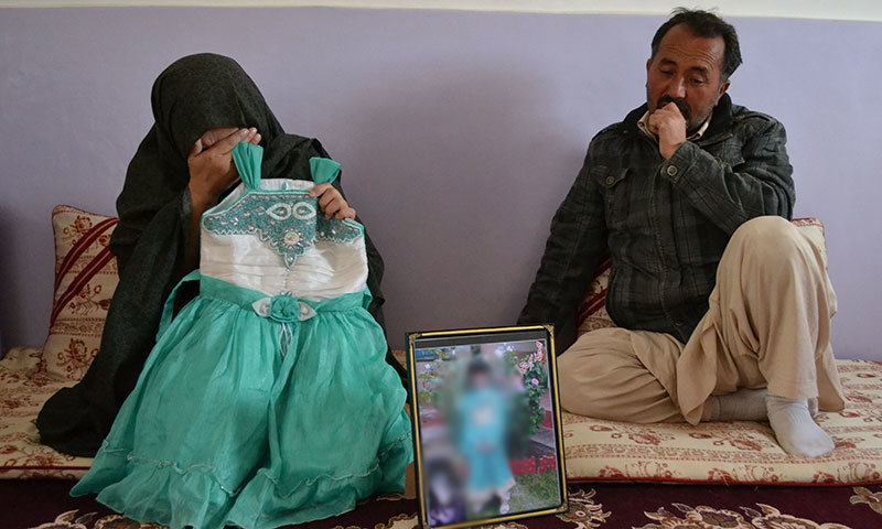 The parents of Sahar Batool, who was from the minority Hazara ethnic group and found dead at a garbage dump, mourn while holding their late daughter's dress in Quetta on November 7, 2014. -AFP photo