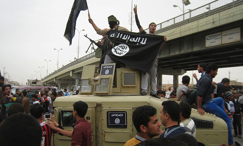 In this March 30, 2014 photo, Islamic State militants wave Al Qaeda flags as they patrol in a commandeered Iraqi military vehicle in Fallujah, 40 miles west of Baghdad. — AP