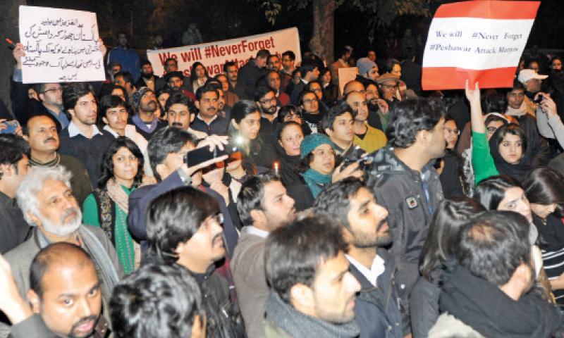 The candlelight vigil and protest was organised in response to a statement by the mosque’s chief cleric Maulana Abdul Aziz in which he refused to condemn the massacre of students and teachers in a terrorist attack on a school in Peshawar.