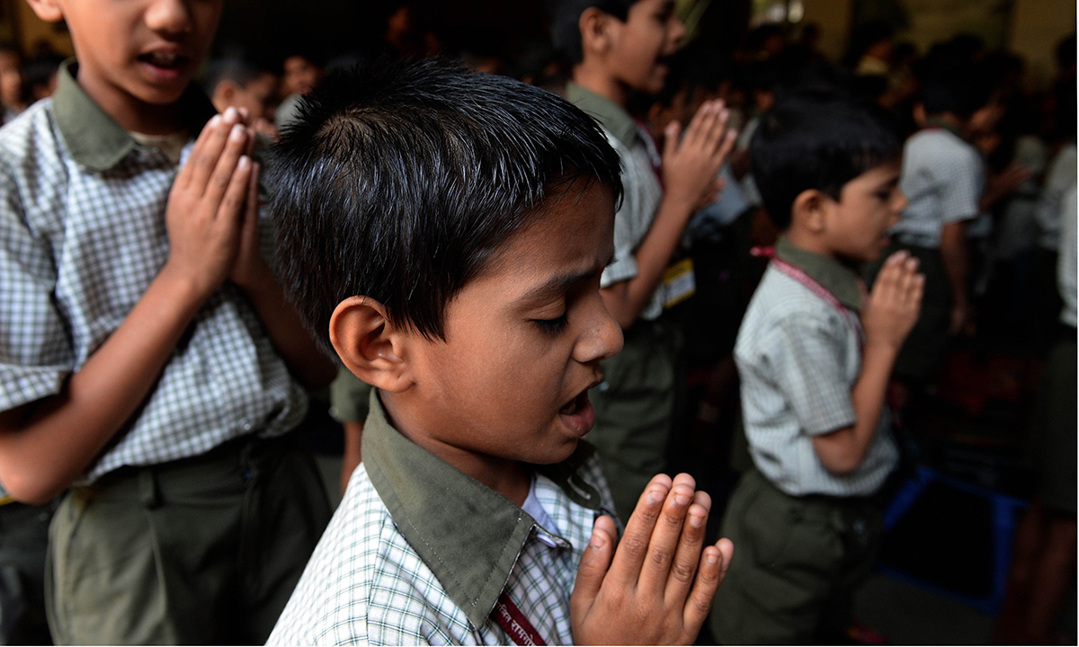 Indian schoolchildren pray at their school in Mumbai. — AFP