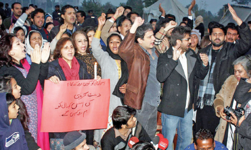 ISLAMABAD : On the third consecutive day of the protest against Maulana Abdul Aziz of Lal Masjid on Saturday, the deputy khateeb of the mosque along with representatives of the federation of seminaries joined the civil society activists to condemn the massacre of schoolchildren in Peshawar.