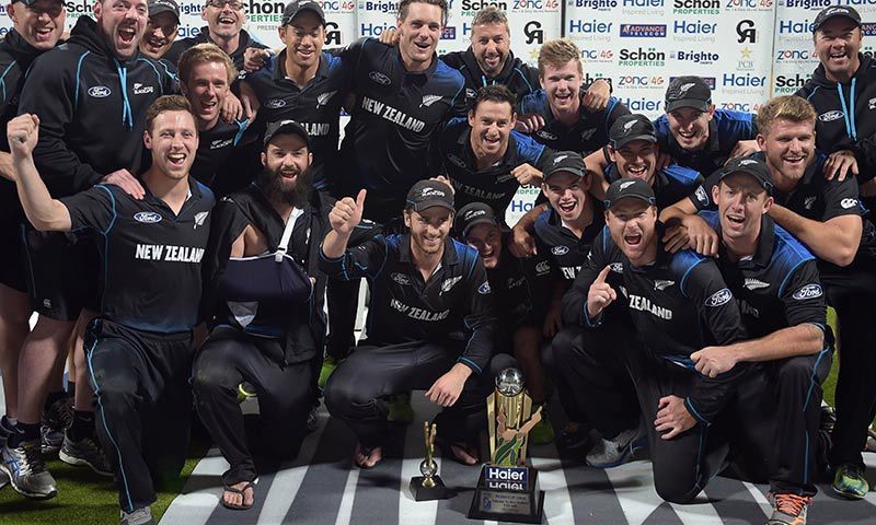 New Zealand's cricketers pose with the winning trophy after the final ODI match between Pakistan and New Zealand in Abu Dhabi. -AFP Photo