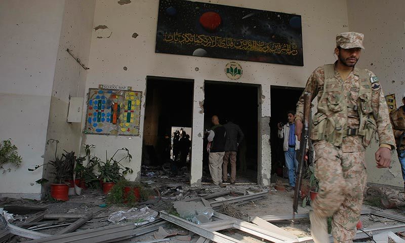 A soldier walks out of the Army Public School that was attacked by Taliban gunmen in Peshawar. — AP
